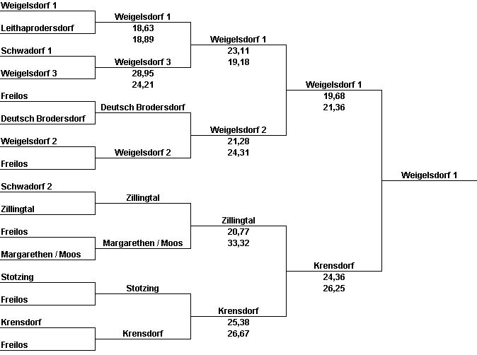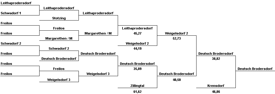 | Am Beispiel Deutsch Brodersdorf ist gut zu erkennen wie man trotz einer Niederlage sich wieder bis zum Finale hocharbeiten kann. Im Finale hat dann Weigelsdorf 1 vom Recht einmal zu verlieren gebrauch gemacht, da ja Weigelsdorf 1 bis zum Finale ungeschlagen blieb. Die Platzierungen vom 1. bis zum 5. Platz lauten also Weigelsdorf 1, Deutsch Brodersdorf, Krensdorf, Weigelsdorf 2 und Leithaprodersdorf. | |