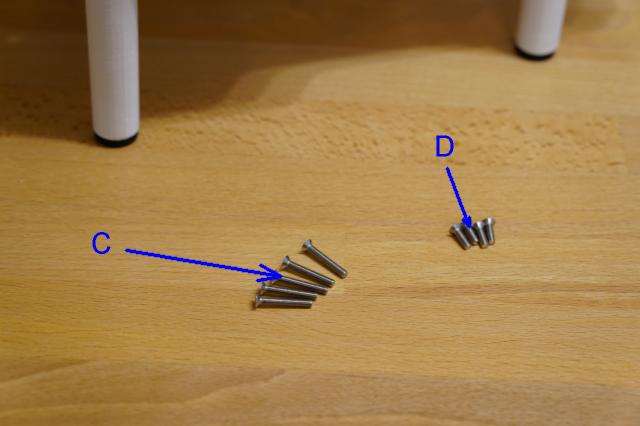 | D) | 4 | Countersunk Screw M3x10 mm | https://www.schraubenking.at/M3-x-10mm-Senkschrauben-DIN7991-Edelstahl-A2-P001577 |