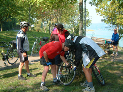 Fahrstrecke 76 kmVom Stüberl fuhren wir den Gailradweg Richtung „Alm“. Wir überquerten die Gail bei der Wehr und fuhren weiter nach Arnoldstein. Beim Anstieg hatte Renate Dolleschal einen „Platten“. Andy tauschte den Schlauch und es ging zügig weiter Richtung Tarvis – kurze Rast an der Grenze - zur Pizzeria Gianini. Dort warteten schon Feichter Alfred, Kofler Christa u. Grafenauer Sonja, die mit dem Auto rauffuhren, auf uns.